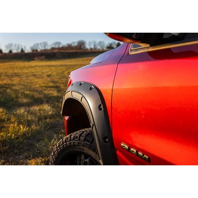 Innovative Design. It's time to stand out from the crowd and rise above your peers. Increase your truck's tire coverage with Rough Country's Defender Flares for the fifth-generation Ram 1500. These aggressively good-looking flares transform your Ram's exterior boasting 2-inches of tire coverage. These uniquely designed flares are sure to protect your Ram's body from mud or road debris kicked up by the tires.\Durable Construction. With everyday truck drivers in mind, Rough Country designed a Fender Flare that recognizes your expectations for tough tactical design, and your right to demand products with high reliability and outstanding quality. Don't settle for anything less! Rough Country's Defender Flares are designed to handle on or off-road terrain. Rough Country's fender flares are constructed of a smooth ABS UV-protected KoradGäó plastic. This material is lightweight and can endure the elements. The UV treatment process eliminates chalking and helps prevent sun fading.\Limited Lifetime Replacement Warranty. Rough Country's Defender Flares are backed with a limited lifetime replacement warranty towards manufacturer defects. As such, the product is protected from structural and workmanship damage after the date of purchase. With our industry-leading warranty give yourself peace of mind when using Rough Country products!\