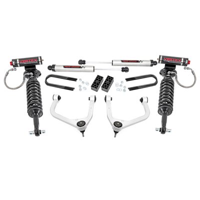 Explore New Heights: GM's fourth-generation Silverado 1500 features an impressive all-new design that's built from the ground up, with aggressive angles and head-turning stylings that fit in beautifully when transformed with Rough Country's 3.5-inch Suspension Lift.Innovative Design and Construction: When changing a vehicle's suspension, the key to preserving ride quality is keeping the geometry of all suspension components as close to their factory angles as possible. Rough Country's 3.5in lift features a set of forged aluminum upper control arms to provide the correct suspension geometry in our most durable control arm to date! This perfect-height lift is a great choice for anyone who wants more than a simple level but doesn't quite want the full height of a 6-inch option. This kit lifts and levels the front of the vehicle with the rear, offering enough increased ground clearance to run up to 33" tires with an improved, aggressive look. We didn't want to limit you to one standard kit. Rough Country's 3.5-inch kit is configurable with all the shock options that we offer. This allows you to choose which shock series you want! Ranging from our nitrogen-charged N3 shocks to our Vertex reservoir shocks the power to choose is in your hands.Installation: Requiring the use of a strut compressor to install, an estimated timeframe of 5-6 hours is recommended to complete this full installation. This full kit can be installed at home and can be completed efficiently and quickly!Limited Lifetime Replacement Warranty: Rough Country's 3.5" Suspension Lift Kit is backed with a limited lifetime replacement warranty towards manufacturer defects. As such, the product is protected from structural and workmanship damage after the date of purchase. With our industry-leading warranty give yourself peace of mind when using Rough Country's Suspension products!