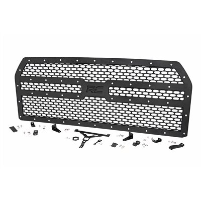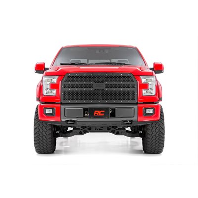 Give the front-end of your Ford F-150 a unique look with Rough CountryGÇÖs Mesh Grille kit! This easy to install grille replacement kit swaps out your stock grille with the eye-catching, head-turning good looks of this aftermarket upgrade. With a unique, laser-cut mesh pattern surrounded by stylish, stainless steel rivets, this grill gives your truck a more menacing look thatGÇÖs sure to draw attention.This easy-to-install grille requires no cutting or drilling and can be returned to stock at any time. Each kit is powdercoated black to resist corrosion and give a long lifespan of good looks. This kit also allows you to retain your active grille shutter system and front camera and features Rough CountryGÇÖs Lifetime Replacement Warranty!\_x000D_\
