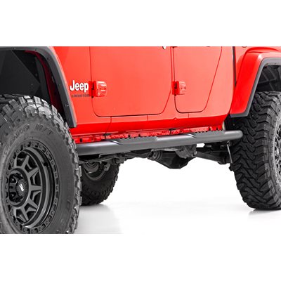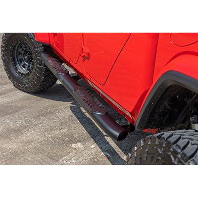 Gain easier access to your cab with the classic, OEM look of Rough CountryGÇÖs Oval Nerf Step Bars. These durable, steel side steps feature a comfortable, 4.5-inch wide stepping area built into a large, tubular nerf rail that mimics the look of the popular OEM oval step design.\Each nerf board features a long-lasting black powder coat and durable steel construction that can support up to 500lbs! Each step offers a 30-degree angled end design looks great on any vehicle. A secure, 4.5-inch wide stepping area features a non-slip pad to ensure a confident footing each and every time.