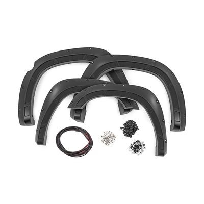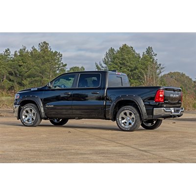 Innovative Design. It's time to stand out from the crowd and rise above your peers. Increase your truck's tire coverage with Rough Country's Defender Flares for the fifth-generation Ram 1500. These aggressively good-looking flares transform your Ram's exterior boasting 2-inches of tire coverage. These uniquely designed flares are sure to protect your Ram's body from mud or road debris kicked up by the tires.Durable Construction. With everyday truck drivers in mind, Rough Country designed a Fender Flare that recognizes your expectations for tough tactical design, and your right to demand products with high reliability and outstanding quality. Don't settle for anything less! Rough Country's Defender Flares are designed to handle on or off-road terrain. Rough Country's fender flares are constructed of a smooth ABS UV-protected KoradGäó plastic. This material is lightweight and can endure the elements. The UV treatment process eliminates chalking and helps prevent sun fading.Limited Lifetime Replacement Warranty. Rough Country's Defender Flares are backed with a limited lifetime replacement warranty towards manufacturer defects. As such, the product is protected from structural and workmanship damage after the date of purchase. With our industry-leading warranty give yourself peace of mind when using Rough Country products!\