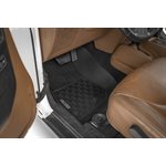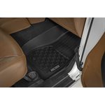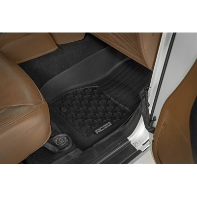 Introducing Flex-Fit floor mats ' the ultimate enhancement for your Jeep's interior and built tough to handle any challenge. Crafted from premium rubber-like material, these mats are as durable as they come, perfectly tailored to fit your Jeep's unique shape for a seamless finish.Stock floor mats just don't cut it for adventurers. They get trashed by mud, don't hold up to spills, and leave your carpets a mess. Give your ride the all-weather protection it deserves with Rough Country's Flex-Fit Floor Mats, the perfect solution for keeping your vehicle clean and protected.All-Weather Protection: Engineered to fit your vehicle perfectly, these mats provide top-notch defense against snow, mud, sand, saltwater, and more.Spill Saver Lip: Don't sweat the spills! Our mats feature a Spill Saver Lip that prevents liquids from reaching your carpet, so you can enjoy your coffee on the go without worry.Non-Slip, Textured Surface: Stay in control no matter the terrain with our mats' non-slip, textured surface, designed to keep your feet firmly planted while driving.Easy to Clean and Maintain: Cleaning up is a breeze! These mats are detachable and easy to clean, so you can spend less time on maintenance and more time hitting the road.Premium Materials: Constructed from a rubber-like TPE material, these mats are built to withstand extreme temperatures without cracking or warping. They will stay flexible and functional for the long haul.Effortless Installation: Forget wrestling with bulky mats. Flex-Fit Mats slide right into place for a quick and frustration-free installation.Upgrade your Jeep's defense against the elements with Rough Country's Flex-Fit Floor Mats. They'll keep your carpets looking fresh and give you peace of mind on every adventure.