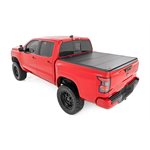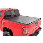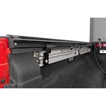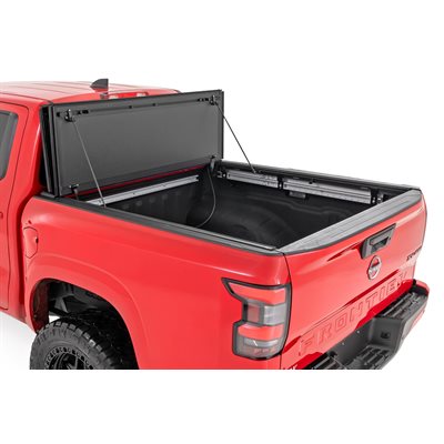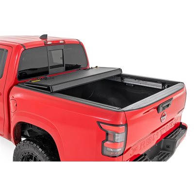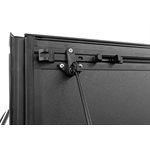 Flush, low-profile design with stylish matte black finish frame and aluminum panels.Tri-Fold 3 panel design allows full bed access.Corrosion resistant black powder coated aluminum frame.Secure track and rail mounting system with drain tubes included.Quick-connect ball-in-socket prop rods secure the cover in the fully open position.Nylon straps secure the cover in the 2/3 open position.Drive with the cover in the fully open, 2/3 open or closed position.Auto latching design secures on closure.Convenient one hand operation squeeze latches release.No drill easy install and removal - all tools included.Nylon safety straps included.5 Year Warranty.