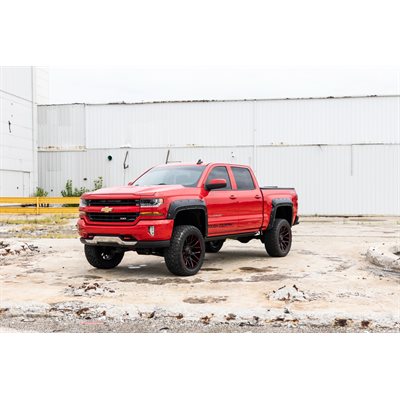 Innovative Design. It's time to stand out from the crowd and rise above your peers. Increase your truck's tire coverage with Rough Country's Defender Flares for the Chevy Silverado 1500. These aggressively good-looking flares transform your Chevy's exterior boasting 2-inches of tire coverage. These uniquely designed flares are sure to protect your Chevy's body from mud or road debris kicked up by the tires.\Durable Construction. With everyday truck drivers in mind, Rough Country designed a Fender Flare that recognizes your expectations for tough tactical design, and your right to demand products with high reliability and outstanding quality. Don't settle for anything less! Rough Country's Defender Flares are designed to handle on or off-road terrain. Rough Country's fender flares are constructed of a smooth ABS UV-protected KoradGäó plastic. This material is lightweight and can endure the elements. The UV treatment process eliminates chalking and helps prevent sun fading.\Limited Lifetime Replacement Warranty. Rough Country's Defender Flares are backed with a limited lifetime replacement warranty towards manufacturer defects. As such, the product is protected from structural and workmanship damage after the date of purchase. With our industry-leading warranty give yourself peace of mind when using Rough Country products!