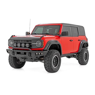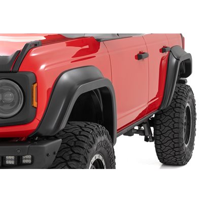 Bold Style & Extra Coverage: Give your Ford Bronco a commanding presence on and off the road with Rough Country's Fender Flares. Designed to enhance your Bronco's rugged appeal, these flares provide increased tire coverage to help shield your ride from mud, rocks, and road debris. Whether you're tackling tough trails or cruising through the city, these aggressively styled fender flares ensure your Bronco stands out from the crowd.Built for Durability: Engineered with everyday adventurers in mind, Rough Country Fender Flares are crafted from a high-strength Tri-Blend ABS material that delivers exceptional toughness without adding unnecessary weight. The UV-protected finish resists fading, ensuring your Bronco's flares maintain their bold look for years to come. Plus, the smooth surface allows for easy painting, so you can match them to your Bronco's color for a factory-style finish.Hassle-Free Installation & Warranty: Featuring a no-drill design, these fender flares install quickly and securely, getting you back on the road in no time. Need to return to stock? They can be easily removed without any hassle. Backed by Rough Country's 3-year limited warranty, you can trust these fender flares to deliver the quality and protection your Bronco deserves.