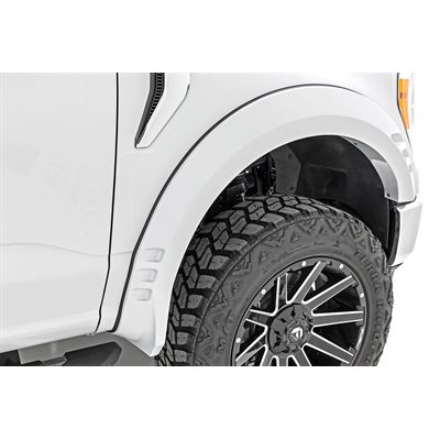 Protect your truck in style.GǻNothing turns heads like the style of your Ford F-150, so why not give it a little extra attitude with Rough Country's SF1 Fender Flares? Not only do they give your vehicle an awesome, simulated riveted look, but they also provide additional protection from rocks and mud. Plus, they offer maximum tire coverage and look great on lifted trucks. And best of all, they're easily paintable to color-match your truck. So, gear up and roll with style with Rough Country's SF1 Fender Flares!\Durability with aggressive looks. Who says you can't have it all? With our SF1 Pocket Fender Flares, you get the best of both worlds! Featuring 2.5" of tire coverage and 5.5" of fender coverage these flares not only look good, they provide your F-150 with some much-needed protection from road debris. Rough Country's Pocket Fender Flares are UV protected to prevent fading. Plus, they're made from a special Tri-Blend ABS material for maximum strength and durability.\Installation.GǻOur SF1 Pocket Fender Flares are a bolt-on install, which means a quick and easy no-drill installation for you! Each order includes step-by-step instructions.\Warranty. Pocket Fender Flares are covered with a 3-year limited warranty. Rough Country's industry-leading warranty gives you the peace of mind to purchase with confidence.