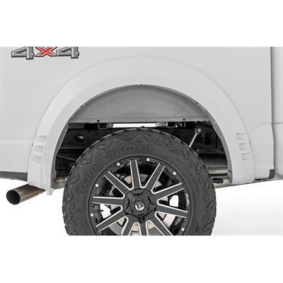 Protect your truck in style.GǻNothing turns heads like the style of your Ford F-150, so why not give it a little extra attitude with Rough Country's SF1 Fender Flares? Not only do they give your vehicle an awesome, simulated riveted look, but they also provide additional protection from rocks and mud. Plus, they offer maximum tire coverage and look great on lifted trucks. And best of all, they're easily paintable to color-match your truck. So, gear up and roll with style with Rough Country's SF1 Fender Flares!\Durability with aggressive looks. Who says you can't have it all? With our SF1 Pocket Fender Flares, you get the best of both worlds! Featuring 2.5" of tire coverage and 5.5" of fender coverage these flares not only look good, they provide your F-150 with some much-needed protection from road debris. Rough Country's Pocket Fender Flares are UV protected to prevent fading. Plus, they're made from a special Tri-Blend ABS material for maximum strength and durability.\Installation.GǻOur SF1 Pocket Fender Flares are a bolt-on install, which means a quick and easy no-drill installation for you! Each order includes step-by-step instructions.\Warranty. Pocket Fender Flares are covered with a 3-year limited warranty. Rough Country's industry-leading warranty gives you the peace of mind to purchase with confidence.