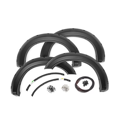 Add aggressive good looks quickly and easily with Rough Country's Fender Flares. Nothing compliments a new lift, wheels, and tires like a set of stylish, mean-looking fender flares. Rough Country's Fender Flares are designed with a simulated riveted look. These fender accessories bolt-on quickly and easily in a few secure mounting points, making installation a cinch. No cutting or drilling is required to install, and these flares can be easily removed and return your truck to stock! These UV treated fender flares ship in flat-black or can easily be painted to match your vehicle, and are designed to withstand the sun, rain and other elements of nature. Rough Country Fender Flares are guaranteed to be free of defects for 3 years!