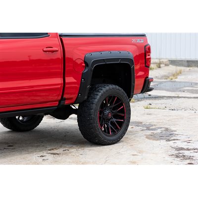 Innovative Design. It's time to stand out from the crowd and rise above your peers. Increase your truck's tire coverage with Rough Country's Defender Flares for the Chevy Silverado 1500. These aggressively good-looking flares transform your Chevy's exterior boasting 2-inches of tire coverage. These uniquely designed flares are sure to protect your Chevy's body from mud or road debris kicked up by the tires.\Durable Construction. With everyday truck drivers in mind, Rough Country designed a Fender Flare that recognizes your expectations for tough tactical design, and your right to demand products with high reliability and outstanding quality. Don't settle for anything less! Rough Country's Defender Flares are designed to handle on or off-road terrain. Rough Country's fender flares are constructed of a smooth ABS UV-protected KoradGäó plastic. This material is lightweight and can endure the elements. The UV treatment process eliminates chalking and helps prevent sun fading.\Limited Lifetime Replacement Warranty. Rough Country's Defender Flares are backed with a limited lifetime replacement warranty towards manufacturer defects. As such, the product is protected from structural and workmanship damage after the date of purchase. With our industry-leading warranty give yourself peace of mind when using Rough Country products!