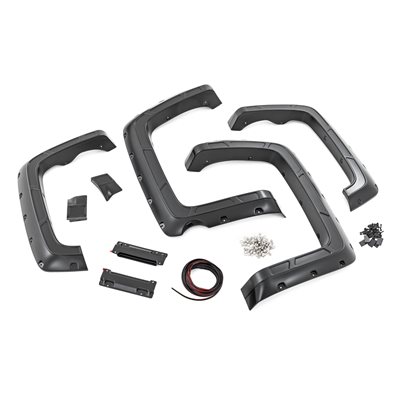 Innovative Design. It's time to stand out from the crowd and rise above your peers. Increase your truck's tire coverage with Rough Country's Defender Flares for the Chevy Silverado 1500. These aggressively good-looking flares transform your Chevy's exterior boasting 2-inches of tire coverage. These uniquely designed flares are sure to protect your Chevy's body from mud or road debris kicked up by the tires.\Durable Construction. With everyday truck drivers in mind, Rough Country designed a Fender Flare that recognizes your expectations for tough tactical design, and your right to demand products with high reliability and outstanding quality. Don't settle for anything less! Rough Country's Defender Flares are designed to handle on or off-road terrain. Rough Country's fender flares are constructed of a smooth ABS UV-protected KoradGäó plastic. This material is lightweight and can endure the elements. The UV treatment process eliminates chalking and helps prevent sun fading.\Limited Lifetime Replacement Warranty. Rough Country's Defender Flares are backed with a limited lifetime replacement warranty towards manufacturer defects. As such, the product is protected from structural and workmanship damage after the date of purchase. With our industry-leading warranty give yourself peace of mind when using Rough Country products!