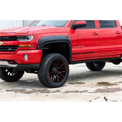 Innovative Design. It's time to stand out from the crowd and rise above your peers. Increase your truck's tire coverage with Rough Country's Defender Flares for the Chevy Silverado 1500. These aggressively good-looking flares transform your Chevy's exterior boasting 2-inches of tire coverage. These uniquely designed flares are sure to protect your Chevy's body from mud or road debris kicked up by the tires.\Durable Construction. With everyday truck drivers in mind, Rough Country designed a Fender Flare that recognizes your expectations for tough tactical design, and your right to demand products with high reliability and outstanding quality. Don't settle for anything less! Rough Country's Defender Flares are designed to handle on or off-road terrain. Rough Country's fender flares are constructed of a smooth ABS UV-protected KoradGäó plastic. This material is lightweight and can endure the elements. The UV treatment process eliminates chalking and helps prevent sun fading.\Limited Lifetime Replacement Warranty. Rough Country's Defender Flares are backed with a limited lifetime replacement warranty towards manufacturer defects. As such, the product is protected from structural and workmanship damage after the date of purchase. With our industry-leading warranty give yourself peace of mind when using Rough Country products!