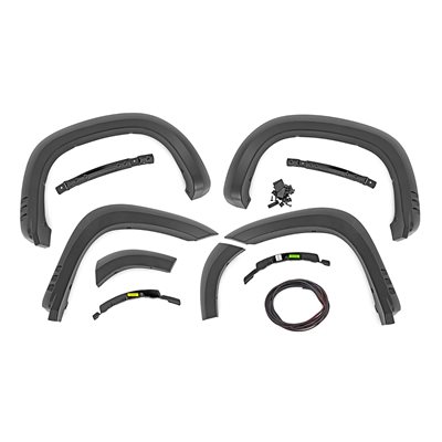 Rough Country's SF1 Fender Flares help you get the tough-looking finishing touch that your build deserves with a one-of-a-kind design. These flares complement the truck's body lines offering a clean look that will turn heads. The SF1 flare design gives the perfect amount of additional tire coverage for an oversized wheel and tire package and feature an integrated rear "mud catcher" to help reduce tire sling down the truck side. They are easy to install on your Chevy Silverado 1500, with excellent fitment right out of the box and includes all necessary hardware. The construction of these flares is from a durable ABS material that is both UV resistant for an uncoated install or paint-ready for a custom color match look.\Not only will you get the utility you need from these flares, but you'll also have a unique and aggressive look for your truck.GÇ» Whether you're looking for functionality or an accessory to tie your lift, wheels and tires together, Rough Country's SF1 fender flares deliver on all fronts.