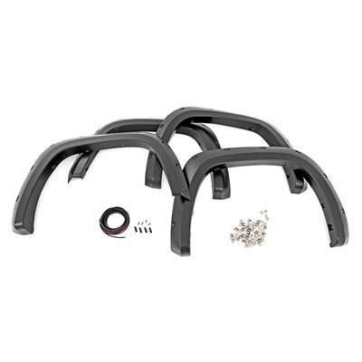 Add aggressive good looks quickly and easily with Rough Country's Fender Flares. Nothing compliments a new lift, wheels, and tires like a set of stylish, mean-looking fender flares. Rough Country's Fender Flares are designed with a simulated riveted look. These fender accessories bolt-on quickly and easily in a few secure mounting points, making installation a cinch. No cutting or drilling is required to install, and these flares can be easily removed and return your truck to stock! These UV treated fender flares ship in flat-black or can easily be painted to match your vehicle, and are designed to withstand the sun, rain and other elements of nature. Rough Country Fender Flares are guaranteed to be free of defects for 3 years!