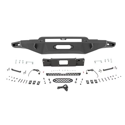 11 gauge main skin. | 7 gauge inner structure/winch tray.Modular so you can select the exact configuration you prefer.Comes with all block-off panels for non-optioned kits.Parking sensor ready.Comes with smoked amber LED lights to block off sensor holes for non-optioned trucks.Recovery points hold standard 3/4" D-Rings with 7/8" pin diameter.Wings hold 6" slim line lights.Center section holds 20" single row light bar.Winch tray designed around RC 9500/12000lb synthetic rope winch.
