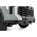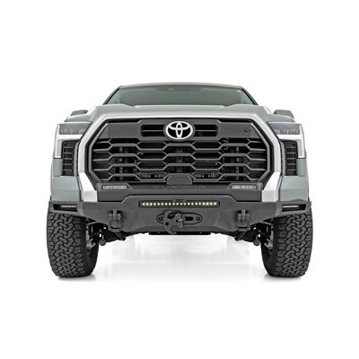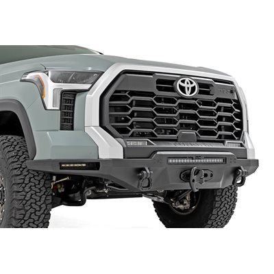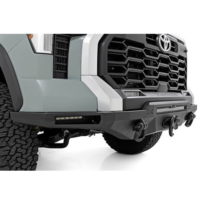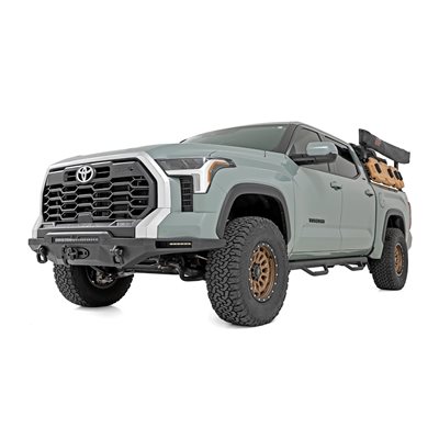 When you're pushing your Toyota Tundra to its limits on the trails, the last thing you want is a bumper that's not up to the challenge. The Rough Country Hybrid Front Bumper is designed to solve that problem, giving you the extra ground and tire clearance needed to navigate rugged terrain with ease.Enhanced Clearance: Built to provide more ground and tire clearance, this bumper allows you to conquer challenging off-road obstacles without the worry of scraping or getting hung up.Rugged Steel Construction: The exterior is made from 11-gauge steel, while the inner structure features 7-gauge steel, ensuring your bumper is ready to withstand the harshest conditions.Optimized Lighting Options: With spacefor 6" slimline lights on the wings and a 20" single-row light bar in the center, this bumper is designed to keep your path well-lit, no matter how dark the trail gets. We also include smoked amber LED lights to cover sensor holes on non-optioned trucks, blending function with style.Durable Recovery Points: Equipped with recovery points that accommodate standard 3/4" D-Rings with a 7/8" pin diameter, this bumper is ready for any situation, providing reliable points for recovery operations.Whether you're hitting the backcountry for a weekend adventure or need a more capable setup for daily driving, the Rough Country Hybrid Front Bumper for your Toyota Tundra is designed to meet those demands with strength and style.