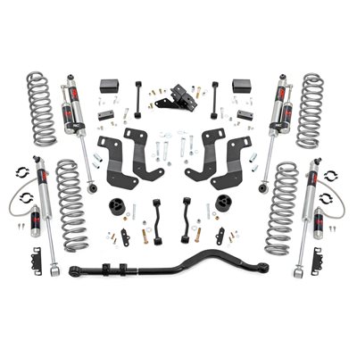 When it comes to your 4-door Jeep JL, we know you need a lift that won't let you down. Our 3.5 Inch Lift Kit delivers legendary off-road prowess and smooth on-road handling.Increased Ground Clearance: Get ready to conquer those rocky trails and rough terrains like a boss! Our lift kit gives your Jeep Wrangler Unlimited the extra inches it needs to clear obstacles with ease.Front-to-Rear Leveling: Tired of that nose-down stance? Ditch the unbalanced Jeep life with our leveling kit. We bring symmetry to your ride, lifting the front to match the rear, giving you a smooth and steady journey.Tuned Coil Springs for Superior Performance: Your Jeep's handling and ride quality matter, and we get that. Our coil springs come dialed in with OEM spring rates, delivering top-notch handling and a plush ride. Our linear coil rate springs take it up a notch, ensuring impeccable handling and stability, even when the terrain gets wild.Additional Tire Clearance: Who doesn't want bigger, beefier tires? Our lift kit makes room for larger tires (up to 35 inches), giving your Jeep a more aggressive look that will turn heads on and off the road!Heavy-Duty Track Bar: Our included track bar is an absolute beast, constructed from forged solid steel for unparalleled strength and durability. With its massive 1.25-inch outside diameter and rugged OEM-style rubber bushings, it's built to handle anything the off-road throws its way.Easy Installation: We know you'd rather be off-roading than in the garage all day. That's why our lift kit is designed for easy installation, so you can hit the trails in no time.At Rough Country, we understand that no two off-road journeys are the same. That's why our 3.5-inch kit is fully adaptable, allowing you to select your preferred shock series: nitrogen-charged N3 shocks for balanced performance, M1 monotube shocks for advanced damping control, V2 monotube shocks for precision handling, or M1R remote reservoir shocks for maximum cooling and unmatched performance on extreme terrain. With Rough Country, you're not just upgrading your Jeep; you're defining your off-road legacy.