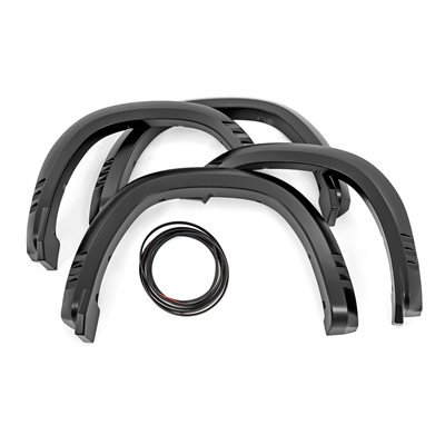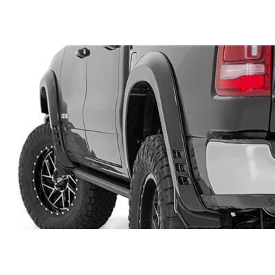 Rough Country's SF1 Fender Flares help you get the tough-looking finishing touch that your build deserves with a one-of-a-kind design. These flares complement the truck's body lines offering a clean look that will turn heads. The SF1 flare design gives the perfect amount of additional tire coverage for an oversized wheel and tire package and feature an integrated rear "mud catcher" to help reduce tire sling down the truck side. They are easy to install on your Ram 1500, with excellent fitment right out of the box and includes all necessary hardware. The construction of these flares is from a durable ABS material that is both UV resistant for an uncoated install or paint-ready for a custom color match look.\Not only will you get the utility you need from these flares, but you'll also have a unique and aggressive look for your truck.GÇ» Whether you're looking for functionality or an accessory to tie your lift, wheels and tires together, Rough Country's SF1 fender flares deliver on all fronts.