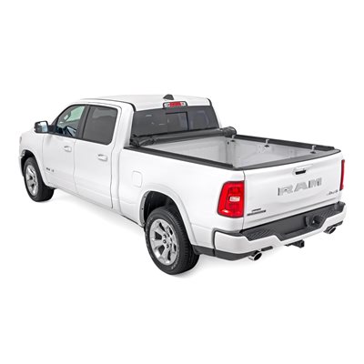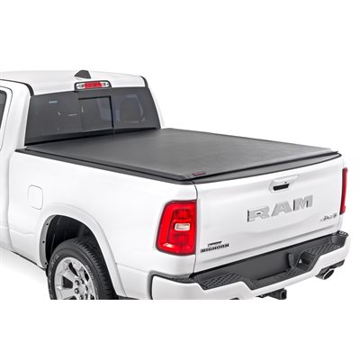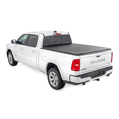 All-Weather Bed Protection: Rough Country's Soft Roll-Up Bed Cover delivers reliable protection against the elements while preserving full bed functionality. Constructed from high-quality, marine-grade vinyl with a sleek matte black finish, this durable cover features heavy-duty hook-and-loop side seals and tight front and rear barriers to shield your cargo from rain, dust, and debris.Streamlined Low-Profile Design: Sitting just 1-1/8" above the bed, this top-mount cover blends seamlessly with your truck's lines for a clean, stylish look. The corrosion-resistant, black powder-coated aluminum frame offers long-lasting strength without sacrificing style or aerodynamics.Fast and Easy Bed Access: The roll-up design and spring-latch closure system make opening and closing the cover a breeze. A single cable pull lets you release the latch quickly, giving you fast access to your full bed whenever you need it. Whether you're hauling gear or unloading tools, convenience comes standard.Effortless Installation: No drilling required - this cover installs in just 20 minutes using the included bracket system and tools. It mounts securely to your factory bed rails for a snug, hassle-free fit you can count on.Protected by a 5-Year Warranty: Rough Country backs this Soft Roll-Up Bed Cover with a 5-Year Replacement Warranty, protecting against structural and workmanship defects so you can hit the road with total confidence.