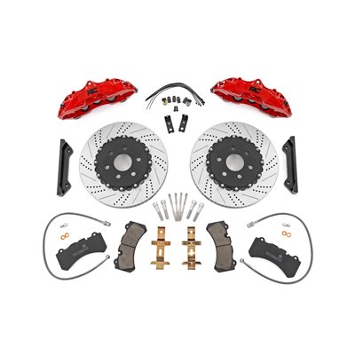 When you're out there pushing your rig to the limit, you need brakes that can keep up. Whether you're navigating rocky trails, or just handling the daily grind, stopping power matters. Lock in control and gain smooth, reliable stopping power every time you brake hard without losing performance.6-Piston Calipers: Feel the difference with our high-performance 6-piston calipers. They provide massive clamping force for quicker stops, even on steep inclines or heavy terrain.Lightweight & Powerful: Our calipers are built lightweight but with more surface area, giving you optimum stopping power without weighing you down.Stainless Steel Durability: With stainless steel pistons and brake lines, this kit delivers top performance with minimal maintenance. It's built tough to handle the harshest conditions.High-Temp Piston Seals: Our Brake Kit comes with seals that handle the heat like a pro, ensuring smooth, reliable performance on the road or off.Oversized, Drilled, and Slotted Rotors: These oversized, two-piece rotors are drilled and slotted to manage heat and debris efficiently. The result? Bigger stopping power that won't let you down, even in the roughest conditions.Ready-to-Go Installation: Everything you need, from banjo bolts to hardware, is included for a fast, secure install.Rough Country's Performance Brake Kit is made to conquer the toughest terrain, delivering reliable and smooth braking. Push your rig to the limit knowing you're in control.
