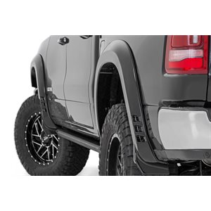 Rough Country's SF1 Fender Flares help you get the tough-looking finishing touch that your build deserves with a one-of-a-kind design. These flares complement the truck's body lines offering a clean look that will turn heads. The SF1 flare design gives the perfect amount of additional tire coverage for an oversized wheel and tire package and feature an integrated rear "mud catcher" to help reduce tire sling down the truck side. They are easy to install on your Ram 1500, with excellent fitment right out of the box and includes all necessary hardware. The construction of these flares is from a durable ABS material that is both UV resistant for an uncoated install or paint-ready for a custom color match look.\Not only will you get the utility you need from these flares, but you'll also have a unique and aggressive look for your truck.GÇ» Whether you're looking for functionality or an accessory to tie your lift, wheels and tires together, Rough Country's SF1 fender flares deliver on all fronts.