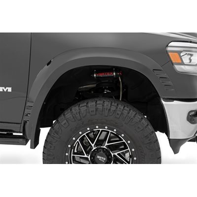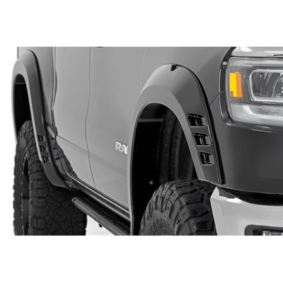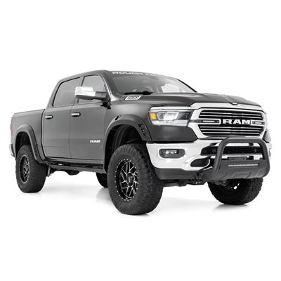 Rough Country's SF1 Fender Flares help you get the tough-looking finishing touch that your build deserves with a one-of-a-kind design. These flares complement the truck's body lines offering a clean look that will turn heads. The SF1 flare design gives the perfect amount of additional tire coverage for an oversized wheel and tire package and feature an integrated rear "mud catcher" to help reduce tire sling down the truck side. They are easy to install on your Ram 1500, with excellent fitment right out of the box and includes all necessary hardware. The construction of these flares is from a durable ABS material that is both UV resistant for an uncoated install or paint-ready for a custom color match look.\Not only will you get the utility you need from these flares, but you'll also have a unique and aggressive look for your truck.GÇ» Whether you're looking for functionality or an accessory to tie your lift, wheels and tires together, Rough Country's SF1 fender flares deliver on all fronts.