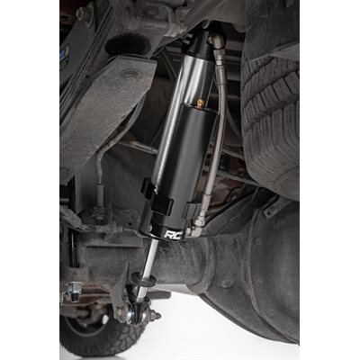 Unrivaled Ride Quality and Precision Tuning: Experience the pinnacle of off-road performance and on-road comfort with Rough Country's 2.5 Vertex Reservoir Shocks. Engineered for enthusiasts who demand elite performance without breaking the bank, these premium shocks deliver smooth handling and rugged durability across any terrain.Built to Dominate, Designed to Impress: Each shock features a massive 2.5-inch piston and high-flow 18mm chrome-hardened piston rod, offering unmatched shock control and fade resistance. The monotube design with external remote reservoir ensures superior heat dissipation and consistent performance, while Nitrogen-charged internals boost response and minimize shock fade in aggressive conditions.Durability That Goes the Distance: A 3-stage fortified seal system keeps out contaminants, extending the life of the shock even in the harshest environments. The honed steel body, paired with heat-treated alloy bearings, provides lasting strength, while a zinc-plated finish with double clear coat and over 400-hour salt spray rating ensures unbeatable corrosion resistance.Premium Styling with Rugged Substance: More than just performance, Vertex shocks stand out with CNC-machined billet aluminum accents, a laser-etched RC logo, and matching "Vertex" decals. Steel-braided reservoir lines and laser-cut brackets on the rear shocks elevate both form and function.Confidence Backed by Coverage: Rough Country backs the Vertex Shocks with an industry-leading 3-year manufacturer's warranty, so you can hit the trail or street knowing your suspension is ready for anything.