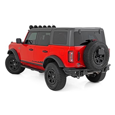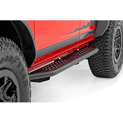 Rough Country's OV2 running board is the perfect combination of off-road style and function. These heavy-duty steel steps feature a rugged tubular construction for strength and rocker panel protection while still boasting a large area for secure footing. With rugged construction and easy installation, it's time to elevate your Bronco's performance and style.Rugged Durability: Made from durable steel and wrapped with a tubular side wall, the OV2 Running Boards offer reliable protection against rocks and debris the trail throws your way. The 1 -+ inch steel tubing provides added body protection, ensuring your Bronco stays in top condition no matter where you go.Ample Stepping Area: With a generous 6 3/4-inch-wide stepping area, these running boards offer plenty of foot room, making it easy to enter and exit your Bronco, even with mud-caked boots.Corrosion Resistance: Finished with a durable powder coat, our running boards are built to withstand the elements and resist corrosion, so they'll look great for years to come.Easy Installation: Say goodbye to complicated installations. The OV2 Running Boards feature a no-drill installation process, allowing you to equip your Bronco for off-road adventures without the hassle.Peace of Mind: Rough Country stands behind the OV2 Running Boards with a limited lifetime warranty, so you can trust that our boards are a reliable investment for your Bronco.Whether you're navigating rocky trails or cruising through mud and sand, these running boards are the ultimate off-road companion, providing a sure step and unmatched protection for your rig.GÇ»