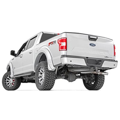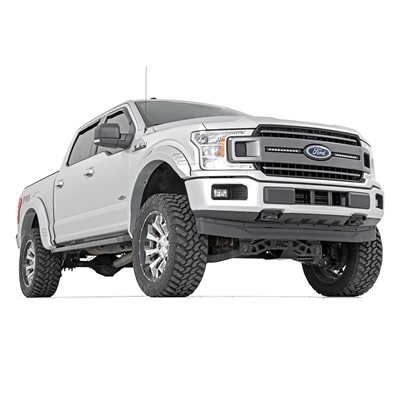 Rough Country's SF1 Fender Flares help you get the tough-looking finishing touch that your build deserves with a one-of-a-kind design. These flares complement the truck's body lines offering a clean look that will turn heads. The SF1 flare design gives the perfect amount of additional tire coverage for an oversized wheel and tire package and feature an integrated rear "mud catcher" to help reduce tire sling down the truck side. They are easy to install on your F-150, with excellent fitment right out of the box and includes all necessary hardware. The construction of these flares is from a durable ABS material that is both UV resistant for an uncoated install or paint-ready for a custom color match look.\Not only will you get the utility you need from these flares, but you'll also have a unique and aggressive look for your truck.GÇ» Whether you're looking for functionality or an accessory to tie your lift, wheels and tires together, Rough Country's SF1 fender flares deliver on all fronts.
