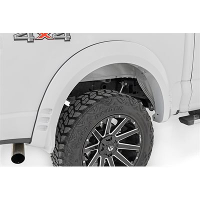 Protect your truck in style.GǻNothing turns heads like the style of your Ford F-150, so why not give it a little extra attitude with Rough Country's SF1 Fender Flares? Not only do they give your vehicle an awesome, simulated riveted look, but they also provide additional protection from rocks and mud. Plus, they offer maximum tire coverage and look great on lifted trucks. And best of all, they're easily paintable to color-match your truck. So, gear up and roll with style with Rough Country's SF1 Fender Flares!\Durability with aggressive looks. Who says you can't have it all? With our SF1 Pocket Fender Flares, you get the best of both worlds! Featuring 2.5" of tire coverage and 5.5" of fender coverage these flares not only look good, they provide your F-150 with some much-needed protection from road debris. Rough Country's Pocket Fender Flares are UV protected to prevent fading. Plus, they're made from a special Tri-Blend ABS material for maximum strength and durability.\Installation.GǻOur SF1 Pocket Fender Flares are a bolt-on install, which means a quick and easy no-drill installation for you! Each order includes step-by-step instructions.\Warranty. Pocket Fender Flares are covered with a 3-year limited warranty. Rough Country's industry-leading warranty gives you the peace of mind to purchase with confidence.
