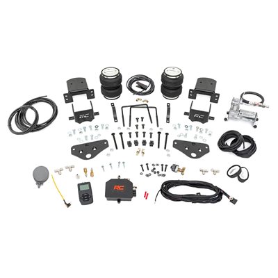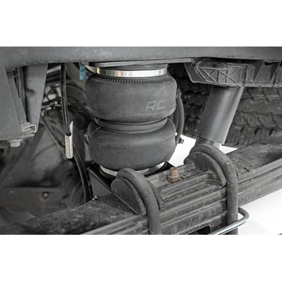 Ideal Leveling: Is your truck your workhorse? The main attraction of a pickup is the ability to haul and tow as needed. However, due to the weight in the bed or the condition of the rear leaf springs, your vehicle may become un-level under load. At Rough Country, we've designed a solution to eliminate these concerns. Introducing Rough Country's Rear Air Spring Kit.Heavy-Duty Construction: Rough Country's Rear Air Spring Kit includes two high-quality, double convoluted air bags, reinforced with durable powder-coated steel brackets and DOT-approved airlines. Whether you're towing a trailer or hauling heavy loads, this kit helps ensure your vehicle remains level, alleviating the strain on your trailer's tongue weight. The kit features 1/4" push-to-connect air fittings for easy installation, along with all necessary bracketry for a secure fit. Rough Country's Air Spring Kit supports up to 5,000 lbs of load, minimizing sway and preventing bottoming out while braking and steering.Easy Installation: Quick and simple setup for immediate use. Rough Country's kit can be installed at home with standard tools in just 5-6 hours, ensuring minimal downtime and fast, hassle-free installation.Onboard Air Compressor and Wireless Controller: For added convenience, Rough Country offers an optional onboard air compressor and wireless controller to easily adjust your air spring kit on the go. Control air pressure at the push of a button from the comfort of your vehicle.Reliable Warranty Coverage: Rough Country's Rear Air Spring Kit includes a limited lifetime warranty on the air springs and a two-year replacement warranty on the compressor, offering lasting protection against manufacturer defects. This industry-leading coverage ensures confidence in both quality and durability, so you can count on Rough Country to keep your truck performing at its best.