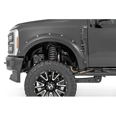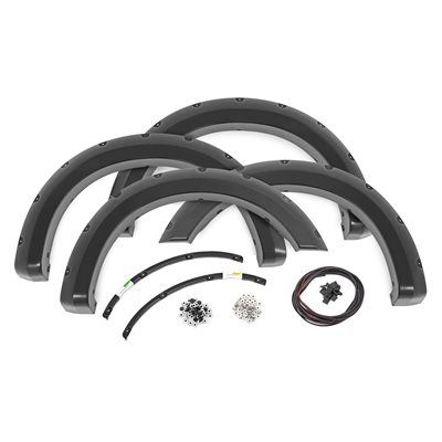 Add aggressive good looks quickly and easily with Rough Country's Fender Flares. Nothing compliments a new lift, wheels, and tires like a set of stylish, mean-looking fender flares. Rough Country's Fender Flares are designed with a simulated riveted look. These fender accessories bolt-on quickly and easily in a few secure mounting points, making installation a cinch. No cutting or drilling is required to install, and these flares can be easily removed and return your truck to stock! These UV treated fender flares ship in flat-black or can easily be painted to match your vehicle, and are designed to withstand the sun, rain and other elements of nature. Rough Country Fender Flares are guaranteed to be free of defects for 3 years!