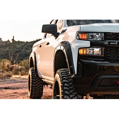 Innovative Design. It's time to stand out from the crowd and rise above your peers. Increase your truck's tire coverage with Rough Country's Defender Flares for the fourth-generation Chevrolet Silverado 1500. These aggressively good-looking flares transform your Silverado's exterior boasting 2-inches of tire coverage. These uniquely designed flares are sure to protect your Chevy's body from mud or road debris kicked up by the tires.\Durable Construction. With everyday truck drivers in mind, Rough Country designed a Fender Flare that recognizes your expectations for tough tactical design, and your right to demand products with high reliability and outstanding quality. Don't settle for anything less! Rough Country's Defender Flares are designed to handle on or off-road terrain. Rough Country's fender flares are constructed of a smooth ABS UV-protected KoradGäó plastic. This material is lightweight and can endure the elements. The UV treatment process eliminates chalking and helps prevent sun fading.\Limited Lifetime Replacement Warranty. Rough Country's Defender Flares are backed with a limited lifetime replacement warranty towards manufacturer defects. As such, the product is protected from structural and workmanship damage after the date of purchase. With our industry-leading warranty give yourself peace of mind when using Rough Country products!\