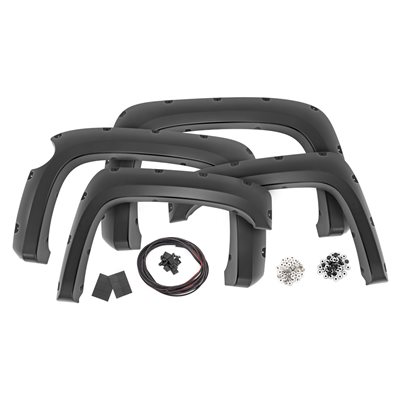 Add aggressive good looks quickly and easily with Rough Country's Fender Flares. Nothing compliments a new lift, wheels, and tires like a set of stylish, mean-looking fender flares. Rough Country's Fender Flares are designed with a simulated riveted look. These fender accessories bolt-on quickly and easily in a few secure mounting points, making installation a cinch. No cutting or drilling is required to install, and these flares can be easily removed and return your truck to stock! These UV treated fender flares ship in flat-black or can easily be painted to match your vehicle, and are designed to withstand the sun, rain and other elements of nature. Rough Country Fender Flares are guaranteed to be free of defects for 3 years!