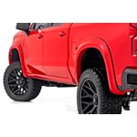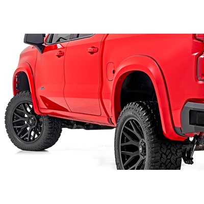 Style and Protection. Unlock the power of real protection and custom style with Rough Country's Sport Style Fender Flares for your fourth-generation Chevy Silverado 1500! Offering 5.75 inches of Flare Height, you know your truck is getting the coverage it needs from flying debris and road grime. Not only will these flares safeguard your vehicle, but they will look great too - featuring a bold custom look that stands out and turns heads. Plus, if you want to take your customization game up a notch, these fender flares are easily paintable so they can match your truck in color and style. Get ready to rock this new rugged look GÇô with Rough Country's Chevy Sport Style Fender Flares!\Sturdy Construction. These bold and rugged fender flares are designed exclusively for Silverado 1500 owners, creating an instant upgrade for your ride. Made from a special Tri-Blend ABS material, these flares have maximum strength and durability, ensuring they will stand up to the toughest conditions that nature has to offer. For added protection, each fender is machine-formed to exact specifications with a high-grade UV protection. Not only do these fender flares look great, but you can trust that they will hold up and continue looking fresh despite the elements.\Installation and Warranty. Featuring an easy and quick installation process, these flares have been designed to provide your truck with the stylish look you've been searching for without any of the hassle. Plus, if you need to bring your truck back to its original specs, the flares can be removed in a flash! But that's not all GÇô each set comes equipped with a three-year limited warranty. Stop dreaming about that showroom-level look and make it happen with Rough Country's Chevy Sport Style Fender Flares.