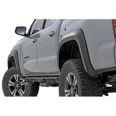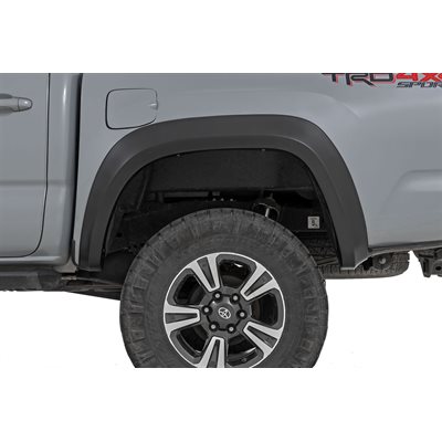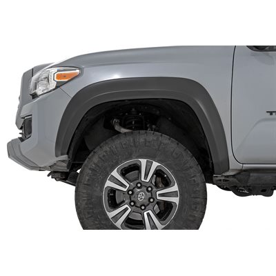 Style and Protection. Unlock the power of real protection and custom style with Rough Country's Sport Style Fender Flares for your Toyota Tacoma! Offering 5.75 inches of Flare Height, you know your truck is getting the coverage it needs from flying debris and road grime. Not only will these flares safeguard your vehicle, but they will look great too - featuring a bold custom look that stands out and turns heads. Plus, if you want to take your customization game up a notch, these fender flares are easily paintable so they can match your truck in color and style. Get ready to rock this new rugged look GÇô with Rough Country's Tacoma Sport Style Fender Flares!\Sturdy Construction. These bold and rugged fender flares are designed exclusively for third-generation Toyota Tacoma owners, creating an instant upgrade for your ride. Made from a special Tri-Blend ABS material, these flares have maximum strength and durability, ensuring they will stand up to the toughest conditions that nature has to offer. For added protection, each fender is machine-formed to exact specifications with a high-grade UV protection. Not only do these fender flares look great, but you can trust that they will hold up and continue looking fresh despite the elements.\Installation and Warranty. Featuring an easy and quick installation process, these flares have been designed to provide your truck with the stylish look you've been searching for without any of the hassle. Plus, if you need to bring your truck back to its original specs, the flares can be removed in a flash! But that's not all GÇô each set comes equipped with a three-year limited warranty. Stop dreaming about that showroom-level look and make it happen with Rough Country's Tacoma Sport Style Fender Flares.