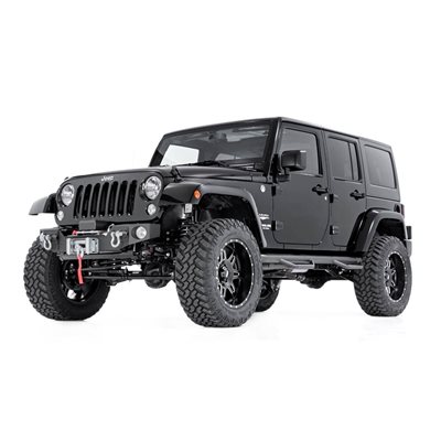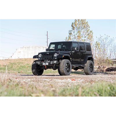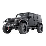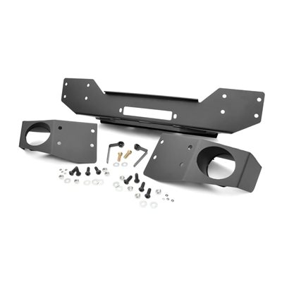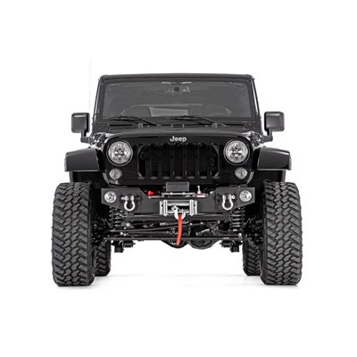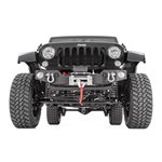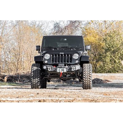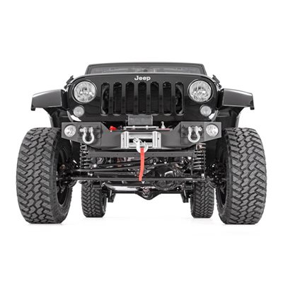 In a perfect world, JK owners would combine the durability and strength of a winch bumper with the affordability and low weight of a winch plate. Thanks to Rough Country, you can live in that world with the all-new JK Hybrid Stubby w/ Integrated Fog Light Mounts. Utilizing an innovative design scheme, Rough Country's Research and Development Team has produced a new type of winch bumper that borrows the best from both sides while remaining easy to install and easy on your wallet.The JK Hybrid Stubby features a thick plate steel center with an integrated winch mount. Two steel end caps with integrated fog light mounts help further protect the winch, partially encasing it - but the real success of this design lies in the fact that these end caps are removable, offering plenty of clearance to easily install or remove the winch. Mount your fairlead to the outside and the result is an easy-to-install winch protection system. Best of all, The JK Hybrid Stubby weighs in at a mere 40lbs! How's that for not bogging you down?This winch bumper is a true stubby. Utilizing the JK's factory bumper mounts and tow hooks, it spans no further than the frame horns and rests below the radiator shroud. Install this bumper and immediately gain greater tire clearance and better approach angles. And with it's sleek Carbon Black Powder coat and aggressive looks, The Hybrid Stubby is prepared to withstand the elements while generating a lot of head-turning on the trails. Be ready to answer a lot of curious cruisers' questions, especially when you tell them it retails for only $229.95!