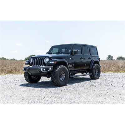 Put the finishing touch on your Jeep Wrangler JL with Rough Country's 2.5-Inch Suspension Lift Kit. Crafted specifically for the 4-door model, this kit provides the clearance to easily run 35-inch tires, taking your JL to new heights with a bold, trail-ready stance.Level Up Your Ride: Eliminate the factory nose-dive and achieve a sleek, leveled look. This lift kit levels the front with the rear, giving your Jeep a rugged stance that can conquer any trail.Improved Off-Roading Performance: Gain the extra ground clearance needed to tackle tough terrain without worry. Optimized approach, breakover, and departure angles ensure your JL performs confidently on challenging trails.Ride Improvement: Linear coil rate springs enhance handling and load support, improving performance both on and off the trail.Custom Shock Options: Configure your lift with your choice of nitrogen-charged N3 shocks, V2, M1 Monotube, or premium M1R shocks to perfectly match your driving style, from comfortable daily driving to maximum off-road control.Additional Tire Clearance: This kit clears up to 35-inch tires, giving your Jeep a more aggressive, head-turning stance.Easy Bolt-On Installation: Designed for hassle-free installation, this 100% bolt-on lift gets you back on the trail faster without the need for complex modifications.