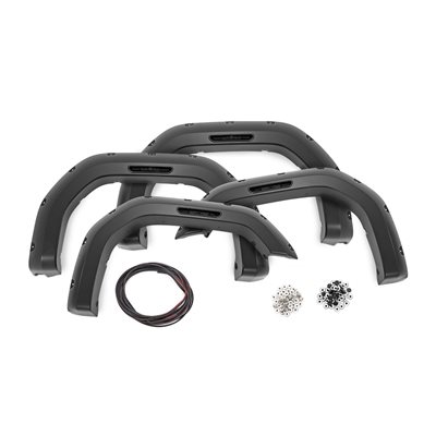 Add aggressive good looks quickly and easily with Rough Country's Fender Flares. Nothing compliments a new lift, wheels, and tires like a set of stylish, mean-looking fender flares. Rough Country's Fender Flares are designed with a simulated riveted look. These fender accessories bolt-on quickly and easily in a few secure mounting points, making installation a cinch. No cutting or drilling is required to install, and these flares can be easily removed and return your truck to stock! These UV treated fender flares ship in flat-black or can easily be painted to match your vehicle, and are designed to withstand the sun, rain and other elements of nature. Rough Country Fender Flares are guaranteed to be free of defects for 3 years!